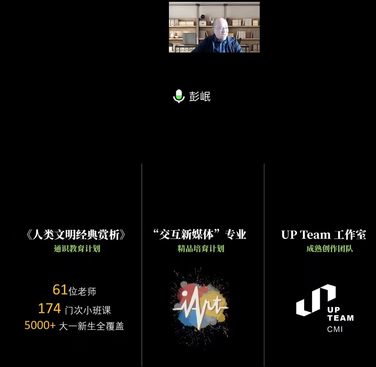 彭岷教授结合电子科技大学的美育实践经验,分享了《人类文明经典赏析》选修课、“交互新媒体”专业、Up Team工作室三个板块的内容。他首先介绍到,《人类文明经典赏析》是电子科技大学开展通识教育的“先导课程”,每年面向大一下学期的员工开设,通过阅读经典、小班研讨等形式,促进员工审美能力提升。然后,彭岷教授介绍了电子科技大学首创的“新工科+新艺术”辅修专业-“交互新媒体艺术”,他从面临的挑战、建设理念、设计思路、培养方案、运作等几方面详细讲述了iArt精品培养计划,该专业尝试用跨学科实训项目促进自主学习和作品交付、用艺术教育开拓创新思维,在理工科大学里培养兼具动手能力和艺术修养的新型工程师。最后,彭岷教授介绍了电子科技大学的成熟创作团队-Up Team工作室,并展示了部分孵化成果。